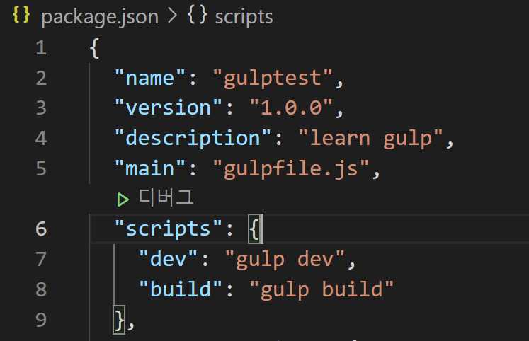 - 지난 1편에서 gulp와 gulp-cli를 설치하셨지요? 이제 그걸 사용하기 위해 package.json에 명령어를 2가지 지정해줍니다. dev는 작업 시 사용되고, build는 build 작업 진행 시 사용합니다.